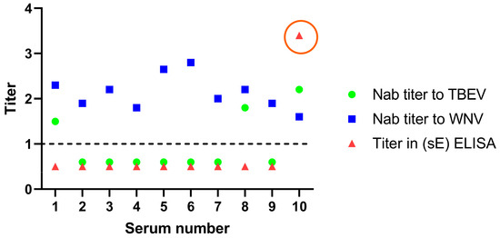 The NAb titer against TBEV was higher than that against WNV in serum #10 only (Table 6). All the sera were then analyzed using our ELISA test system. When sE recombinant proteins were used, all sera were negative except serum #10. The resulting data show the high specificity of our system since only serum #10 was positive in ELISA (Figure 3).