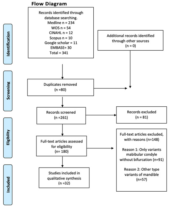 The search strategy included a combination of the following terms: “Anatomy mandibular condyle” (No MeSH), “variation mandibular condyle” (No MeSH), “bifid mandibular condyle ” (No MeSH terms), “trifid mandibular condyle” (No MeSH), “variation anatomical” (No MeSH), “clinical anatomy” (No MeSH), and “pathologies temporomandibular joint” (No MeSH), using the Boolean connectors “AND”, “OR”, and “NOT”.