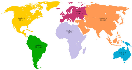 Among the 32 included studies, 11 were case reports, 21 were retrospective studies and none were prospective studies. The samples included in the reviewed studies were geographically distributed across all continents except Africa and Oceania. A total of 11 studies were conducted in Europe which is equivalent to 34.37%. The cumulative number of patients in these studies was 34,750, accounting for 39.21% of the reviewed samples. Among the reviewed studies, 14 were conducted in Asia, which was equivalent to 43.75% of the studies included in this review; the cumulative number of patients in these studies was 3395, which is equivalent to 3.83% of samples included in our analysis. Three studies were conducted in North America, which is equivalent to 9.37% of the studies included in this review. It should be noted that the cumulative number of patients in these three studies was 24, which accounts for 0.03% of the sample size included in our analysis. Four studies were conducted in South America, accounting for 12.5% of the studies included in this review, and the cumulative number of patients in these studies was 50,456, or 56.93% of the analyzed samples (Table 1 and Figure 3).