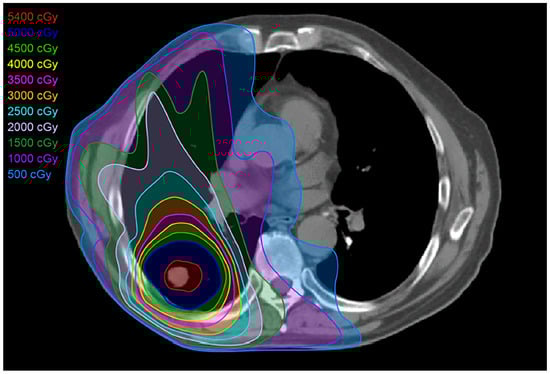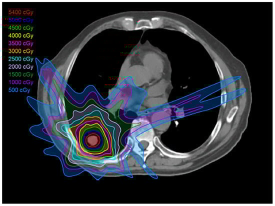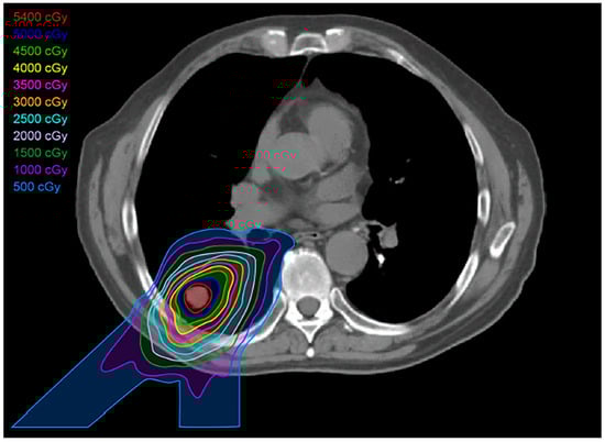 Stereotactic body radiotherapy (SBRT) is currently the predominant modality of high-precision radiation therapy utilized for early-stage NSCLC patients who are not surgical candidates or who refuse surgical therapy [15,16] (Figure 4). SBRT utilizes ablative techniques to target tumors, delivering a higher radiation dose per fraction over a shorter treatment duration compared with conventional RT (SBRT 1–2 weeks vs. conventional 4–6 weeks) [9,10]. SBRT must be used with caution when targeting central tumors, due to the potential for toxicity. An early trial reported toxicities and mortality for central tumors treated with SBRT, which led to a recommendation of a 2 cm “no fly” zone surrounding the central bronchial tree [17]. SBRT can be used for central lung cancers by lowering the dose per fraction. SBRT offers decreased toxicity when compared with other forms of RT.