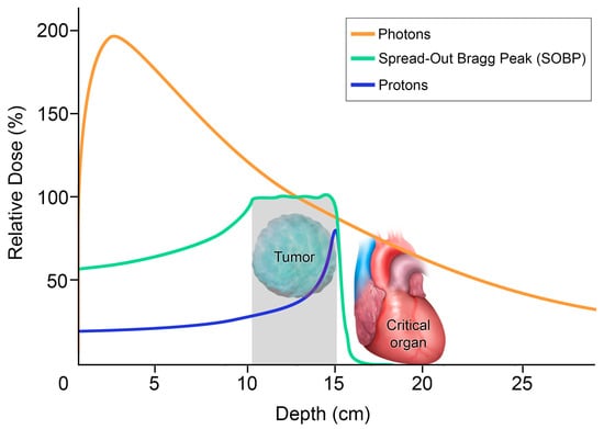 Differential depth–dose distribution of photons versus protons: The graph plots the relative dose with respect to the penetration depth. The orange is the radiation dose with photons. With no mass and no charge, photons can penetrate, but most of the radiation dose delivered is only in the first 3 cm from the patient’s skin. Photons gradually lose this energy until they reach the target and continue to deposit the dose as they exit the body, with potential collateral damage to adjacent critical organs. In contrast, protons, shown in blue for single beam and in green for multiple beams spread out, have a lower entrance dose. Protons are heavy charged particles that gradually slow down as they interact with bodily tissues. The absorbed dose increases gradually, with a sharp rise to a peak when the protons are stopped at the site of the tumor, where there is a large deposit of energy. This is known as the Bragg peak. The abrupt decrease in dose distal to the tumor target yields a minimal exit dose, sparing the adjacent critical organs.