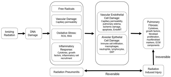 The pathophysiology of radiation injury: Ionizing radiation induces free radicals and DNA damage to promote oxidative stress, vascular damage, and inflammation, which manifest as radiation pneumonitis. Persistent inflammation sustains alveolar epithelial and vascular endothelial cell damage and contributes to pathological changes, including immune cell infiltration, capillary permeability, and pulmonary edema. Prolonged alveolar and vascular damage lead to epithelial-to-mesenchymal transition (EMT) and/or endothelial-to-mesenchymal transition (EndoMT) and eventually culminate in fibrotic changes. Adapted from Hanania, AN. Chest 2019, (156): 150 [1].