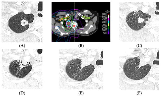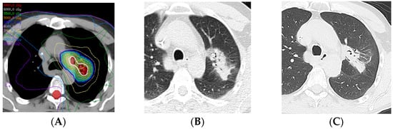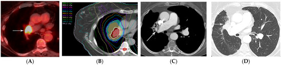 - Li, Q.; Liu, Y.; Su, B.; Zhao, H.; Lin, Q.; Zhu, Y.; Zhang, L.; Weng, D.; Gong, X.; Sun, X.; et al. The CT appearance pattern of radiation-induced lung injury and tumor recurrence after stereotactic body radiation therapy in early stage non-small cell lung cancer. Transl. Lung Cancer Res. 2020, 9, 713–721. [Google Scholar] [CrossRef]