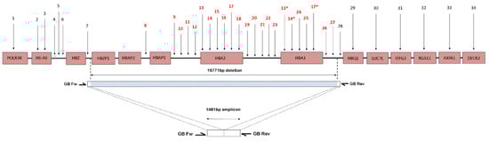 Alpha (α)-thalassaemia is the most common inherited disorder resulting from a reduced rate of synthesis of the α-globin chain. The prevalence of alpha thalassaemia trait in local studies including the Southeast Asia regions is higher (4.08% to 48.9%) [1,2,3,4,5,6] compared to beta (β)-thalassaemia carriers, which are reported by many researchers and range from 0.93% to 12.8% [1,2,5,7]. In one meta-analysis study involving 83,864 thousand subjects in the Southeast Asian region, the prevalence of α-thalassaemia in Malaysia is 17.4%, which is lower compared to the overall prevalence in the Southeast Asian region, which is 22.6% [8]. The difference in frequencies could be attributed to the different populations studied, with different inclusion criteria and due to the relatively smaller sample size in particular studies. Genomic deletions involving the α-globin gene cluster on chromosome 16p13.3 are the most frequent causes. The function of the α-globin gene cluster 16p13.3 requires the presence of a major upstream regulatory element, referred to as the HS-40 because it is 40 kilobases (kb) upstream to the ζ2 locus [3]. To date, more than 70 different deletions involving the alpha globin gene clusters have been described (https://globin.bx.psu.edu/cgi-bin/hbvar/query_vars3 accessed on 1 March 2023).