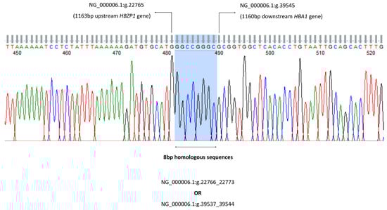 The 8 bp homologous sequences can be found at both 5′ and 3′ deletion breakpoints either at NG_000006.1:g.22766_22773 or NG_000006.1:g.39537_39544. Thus, the −−GB deletion can be mapped either from the 1164 bp upstream of HBZP1 to 1151 bp downstream of HBA1 gene (NG_000006.1:g.22766_39536del), or from the 1156 bp upstream of HBZP1 to 1159 bp downstream of HBA1 gene (NG_000006.1:g.22774_39544del).