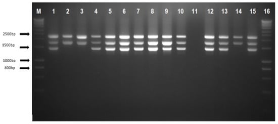 Agarose gel electrophoresis of PCR products using gap-PCR assay. Lanes M and 16 show DNA marker ladders (hyperladders). Lane 1 shows positive control for heterozygous --GB deletion; lane 2 shows normal control with the 2503 bp depicting the LIS internal control band and the 1800 bp α2 globin gene band; lanes 4–10, 12–13, and 15 indicate heterozygous --GB deletion; lane 11 shows a negative control template; and lanes 3 and 14 show samples with a normal result.