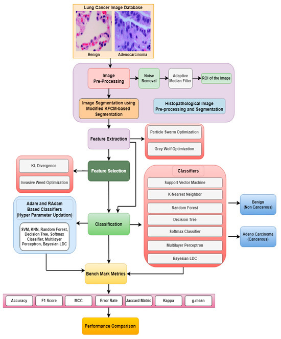 Figure 1 shows the general schematic diagram for identifying and categorizing lung cancer in histopathological images. The input histopathological image will undergo conversion into a linear vector comprising 65,536 elements (due to the image’s size of [256 × 256]). The procedure involves image pre-processing and a modified KFCM-based segmentation. During segmentation process approximately as [190 × 190] of the original image (i.e., nearly 36,100 intensity values) are segmented and used for further processing. These values will be directly employed to initialize the positions of birds in the Particle Swarm Optimization (PSO) and grey wolves in the Grey Wolf Optimization (GWO) algorithms. Optimization algorithms such as PSO and GWO are used to obtain a matrix of [512 × 10] dimensionally reduced intensity values from the segmented images. These dimensionally reduced features undergo feature selection techniques such as KL divergence and IWO. The selected features are then inputted into classifiers to evaluate their performance of the classifiers. Furthermore, an enhancement in the accuracy of lung cancer classification across various classifiers including SVM, KNN, Random Forest, Decision Tree, Softmax Discriminant, Multilayer Perceptron, and BLDC classifiers is achieved through the implementation of a Hyper Parameter Updation algorithm based on the RAdam technique.