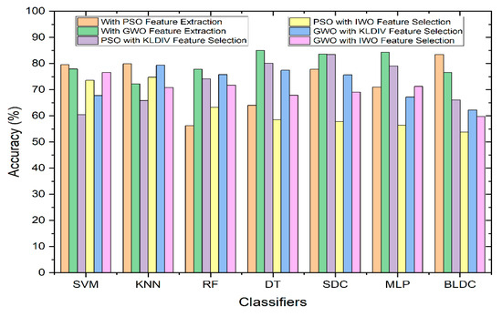 As evident from Table 19, when feature extraction techniques are not employed, classifiers such as SVM, KNN, Random Forest (RF), Decision Tree (DT), Softmax Discriminant classifier (SDC), Multilayer Perceptron (MLP), and Bayesian LDC (BLDC) exhibit lower levels of computational complexity. When utilizing the GWO feature extraction technique, the Decision Tree classifier stands out with a computational complexity of and achieves a high accuracy of 85.01%. However, the BLDC classifier, with a computational complexity of for GWO feature extraction, performs poorly when IWO feature selection methods are applied across the classifiers. The observed underperformance is linked to outlier problems present in the GWO features. To improve classifier performance, this study integrates hyperparameter tuning into the IWO feature selection method. Particularly, the Decision Tree classifier demonstrates remarkable performance with accuracies of 90.07% and 91.57% when utilizing GWO feature extraction in conjunction with IWO. These improvements come with a moderate computational complexity represented by for the Adam Hyperparameter tuning approach and for the RAdam Hyperparameter tuning approach.