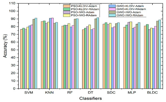 Figure 8 displays how classifiers perform when hyperparameter tuning methods such as Adam and RAdam are used to enhance accuracy. Even after applying feature selection techniques, there’s no significant improvement in classifier accuracy compared to using no feature selection. To address this, hyperparameter update algorithms are introduced. The accuracy achieved through the KL Divergence feature selection method is notably high across all classifiers. However, for the IWO feature selection technique, accuracy seems to be somewhat lower. This prompts the use of hyperparameter update algorithms specifically for the IWO feature selection. As a result of employing these algorithms, there’s a substantial accuracy improvement for all classifiers using the IWO feature selection. Notably, the Decision Tree classifier combined with GWO feature extraction and IWO feature selection, along with the RAdam hyperparameter update algorithm, achieves the highest accuracy at 91.57%.