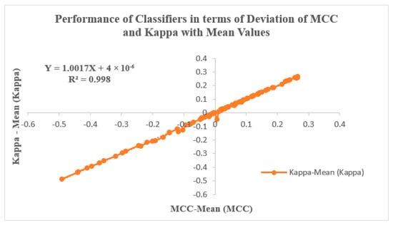Figure 9 illustrates the classifiers’ performance by analyzing the Deviation of MCC and Kappa parameters in relation to their mean values. These parameters, MCC and Kappa, serve as benchmarks for evaluating how classifiers respond to different inputs. The study involves two input categories: features extracted using PSO and GWO, followed by feature selection through KL Divergence and IWO. The selected features are then inputted into the classifiers, and their effectiveness is evaluated through the resulting MCC and Kappa values. The average MCC and Kappa values attained from the classifiers are 0.56661 and 0.56256, respectively. A methodology is devised to assess classifier performance by examining the variability of MCC and Kappa values from their respective means. Notably, Figure 9 depicts a trend where MCC and Kappa values in the graph’s third quadrant correspond to non-linear outcomes with lower performance metrics. Conversely, values in the graph’s first quadrant indicate improved classifier performance, with MCC and Kappa values surpassing the average. This pattern suggests an enhancement in classifier performance for GWO inputs when coupled with IWO feature selection, particularly within the context of the RAdam hyperparameter tuning approach. Figure 9 is also characterized by a linear curve fitting described by the equation Y = 1.0017 X + 4 × 10−06, with an R2 value of 0.998.