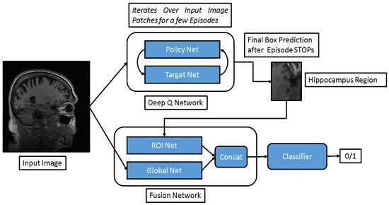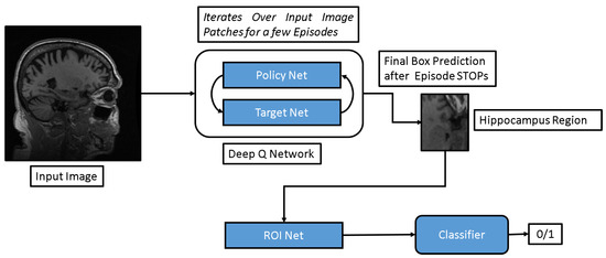 The inputs to the DQN model comprise 2D slices categorized as either AD or CN, all of which have undergone preprocessing. This DQN network comprises two key components: Policy Net and Target Net. Both networks are structured with three convolution layers followed by two fully connected layers. During training, the Policy Net is updated after each episode, while the Target Net shares weights with the Policy Net every few episodes and is not trained separately. During testing, only the Target Net is utilized for predictions. Subsequently, the output of the DQN model feeds into the ROI Net, as depicted in Figure 2. The ROI Net consists of three 2D convolutional layers, followed by two fully connected layers for classification. The ROI Net’s output provides a prediction score of 1 for AD and 0 for CN.