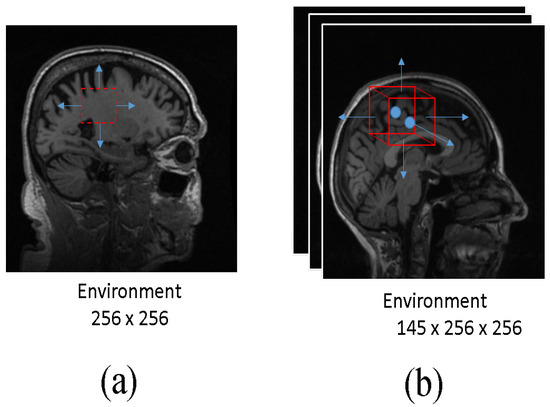 The data used in this study were obtained from Alzheimer’s Disease Neuroimaging Initiative (ADNI, http://adni.loni.usc.edu/ (accessed on 5 January 2021)). We conducted a subject-level data division, separating subjects into training and testing sets in such a way that no sample seen during training would be repeated during testing. The dataset used was ADNI-1 with a total of 255 subjects. There were 100 samples for AD and 100 for CN. We performed 5-fold cross-validation on a held-out test set, comprising 55 samples (25 samples for CN and 30 samples for AD). Additionally, we extracted bounding boxes for the hippocampus mask provided for each sample of 3D sMRI. Due to variations in the number of slices and image dimension across different samples, we resized each sample to have dimensions of . In this work, we subdivided the dataset into two subsets: 2D slice set and 3D set. We trained the proposed model and present results on reinforcement learning (RL)-based localization technique for both sets.