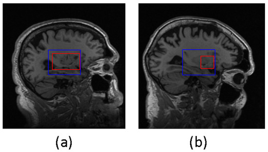 Poor localization outcomes from DQN. Blue box represents the predicted bounding box, and red box represents the truth hippacapus region. In (a) the hippocampal region was correctly extracted but the agent failed to generate the bounding box that properly encloses the hippocampal region. In (b) the error lies in the accurate representation of the hippocampal ground truth itself.