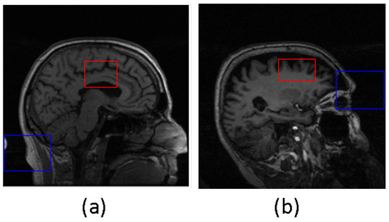 Satisfactory localization outcomes from DQN in both examples (a) and (b). Blue box represents the predicted bounding box, and red box represents the truth hippacapus region.