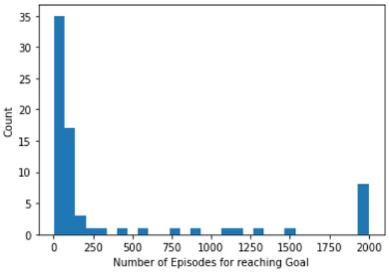 We conducted additional experiments on the DQN ROI Net (2D model) to investigate two strategies for terminating the episodes within the RL algorithm. In the first approach, the agent selects the Terminate action, resulting in an immediate end to the episode. Subsequently, the model provides the last region accessed in the image as the localization result. In the second approach, the agent is allowed to take no action when the Terminate action is selected. In this scenario, the episode continues for a fixed duration of 100 episodes before concluding, with the localization output being the last region accessed by the agent.The results shown in Figure 3 were obtained using this second strategy. In contrast, when employing the first strategy, the RL agent is allowed to exit the episode as soon as the Terminate action is chosen. This offers the advantage of designing a faster localization algorithm. However, it adversely impacts the overall performance of the model on the classification task. As depicted in Figure 7, we present a plot illustrating the relationship between the count and the number of episodes required for the agent (in the case of the 2D model) to converge to the goal in the first scenario mentioned above. Notably, approximately ≈85% of the time, the agent completes its goal within ≤200 episodes. However, the accuracy achieved by this model on AD vs. CN classification using the DQN ROI Net was , which is lower than the accuracy achieved by employing the second strategy.
