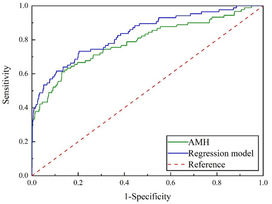 The AUC, sensitivity, specificity, Youden index, positive likelihood ratio, and negative likelihood ratio of the AMH threshold value were as follows: AUC = 0.810, sensitivity = 71.79%, specificity = 77.31%, Youden index = 0.4910, positive likelihood ratio = 3.16, and negative likelihood ratio = 0.36. Similarly, for the AMH threshold value, the AUC, sensitivity, specificity, Youden index, positive likelihood ratio, and negative likelihood ratio were as follows: AUC = 0.847, sensitivity = 74.77%, specificity = 82.04%, Youden index = 0.5681, positive likelihood ratio = 4.16, and negative likelihood ratio = 0.31. Based on the AUC values, both serum AMH testing and regression models showed moderate effectiveness in predicting EPL in PCOS patients aged 20 to 39 years. However, the regression model was found to be superior to the serum AMH test (p < 0.05).