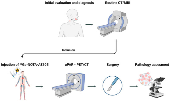 In this prospective phase II trial, patients with biopsy-verified OSCC and OPSCC, with or without suspicion of regional neck metastases, referred for primary surgery at the Department of Otolaryngology, Head & Neck Surgery and Audiology, Rigshospitalet, Copenhagen University Hospital, Denmark, were prospectively enrolled between November 2016 and January 2022. Patients between the ages of 18 and 85 years, who were able to read, comprehend and provide informed consent, were eligible. Exclusion criteria were previous surgery or radiation therapy to the neck, obesity (bodyweight > 140 kg), allergy to 68Ga-NOTA-AE105 or pregnancy. Patients were enrolled in this trial following a standard evaluation and imaging work-up. The study design is shown in Figure 1. From patient records, data on age, gender, stage, preoperative imaging modalities, laboratory findings and histology results were obtained. Patients’ disease stage was classified according to the 8th edition of the Union for International Cancer Control (UICC) staging manual [19]. Patients included between 2016 and 2018, i.e., prior to the introduction of the 8th edition of the UICC staging manual, were subsequently reclassified according to this edition, so that all patients were classified according to the most recent TNM staging manual. The study was approved by the Danish Research Ethics Committee (protocol no. H-16032922) and the Danish Medicines Agency (protocol no. 2016122500). The trial was registered in the European Union Drug Regulating Authorities Clinical Trials Database (EudraCT no. 2016-002360-14) and on ClinicalTrials.gov (Identifier: NCT02960724) and conducted in compliance with the Good Clinical Practice (GCP) recommendations.