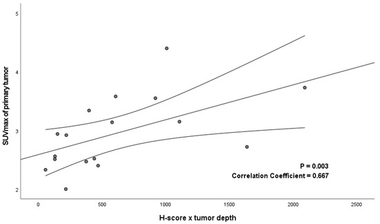 All primary tumors and lymph node metastases detected by CT exhibited uPAR-expression. Seventeen of the eighteen primary tumors with measurable SUV values were available for immunohistochemical examination and were assessed digitally using Qupath (Figure 4). The mean proportion of positive cells in the tumor compartments of the uPAR-PET/CT-detected tumors was 44.7 ± 22.7% and they had an H-score of 66.9 ± 36.2. A significant correlation was found in primary tumors between the SUVmax and the product of the H-score and tumor depth (p = 0.003; r = 0.67) (Figure 5). There was not sufficient tissue available from lymph node metastases to obtain a meaningful correlation between the SUV values and immunohistochemistry results.