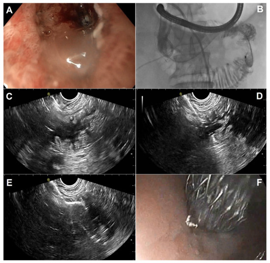 EUS-guided gastroenterostomy in a patient with duodenal stenosis from invasive pancreatic cancer previously treated by duodenal stenting using the WEST technique: (A) endoscopic image of a duodenal stent with tumoral ingrowth; (B) radiologic image depicting a 7 Fr nasobiliary catheter placed through the stricture after guidewire placement, through which saline and contrast are infused; (C) EUS identification of the jejunal target loop using fluid cavitation and identification of the nasobiliary catheter; (D) free-hand intrajejunal access with the electrocautery device (100 W, effect 5); (E) intrajejunal distal flange deployment under EUS guidance; (F) intragastric proximal flange deployment under endoscopic control.