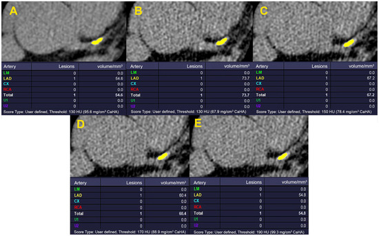 Comparison of the calculated CACS in standard (120 kVp FBP-reconstructed protocol with HU threshold: 130). (A) with 80 kVp FBP-reconstructed method applying HU thresholds: 130, 150, 170, and 190 (B–E). CACS was calculated for a proximal LAD artery lesion. Despite negligible visual differences in plaque shape, by increasing the HU threshold, the deviation of the calculated CACS from the standard image (A) declines. The nearest calculated CACS to the standard image is observed on image (E) at the HU threshold of 190. CACS: Coronary artery calcium score; FBP: filtered back projection; HU: Hounsfield unit; LAD: left anterior descending.
