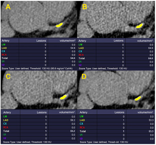 - Choi, A.D.; Leifer, E.S.; Yu, J.; Shanbhag, S.M.; Bronson, K.; Arai, A.E.; Chen, M.Y. Prospective evaluation of the influence of iterative reconstruction on the reproducibility of coronary calcium quantification in reduced radiation dose 320 detector row CT. J. Cardiovasc. Comput. Tomogr. 2016, 10, 359–363. [Google Scholar] [CrossRef]