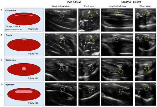 Ultrasound image of peak contrast enhancement in multiple musculoskeletal models after injection of PVO and SonoVue®. (A) Laceration model. (B) Punch model. (C) Contusion model. (D) Injection model.