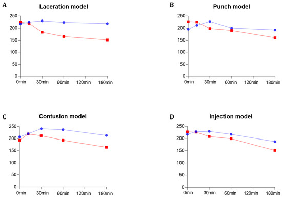 Quantitative grayscale analysis of the maximum echogenicity for PVO and SonoVue® within the four multiple musculoskeletal rat models (laceration, punch, contusion, and injection models) using image J quantification software 1.53p (https://imagej.nih.gov/ij/ accessed on 4 March 2022). (A) Laceration model. (B) Punch model. (C) Contusion model. (D) Injection model. The blue graph represents PVO, while the red graph indicates SonoVue®.