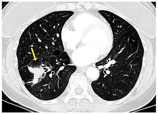 DLBCL is the second most common pulmonary lymphoma (10–20% of cases) [,]. Most cases of primary lung DLBCL correspond to large cell transformation of pulmonary MALT lymphoma, whereas the pathogenesis of de novo DLBCL is unclear. DLBCL is a disease of adults, with a mean age of 60 years. Contrary to MALT lymphoma, most patients present with B symptoms. On imaging, primary pulmonary DLBCL tends to present as a single peripheral mass with sharply demarcated borders, but this may not be the case for a DLBCL arising from MALT lymphoma that may present as an ill-defined mass. DLBCL may present as multiple lung nodules, usually in the setting of systemic disease. On CT scan, DLBCL can show central necrosis [], and about 50% of patients have hilar lymphadenopathy.