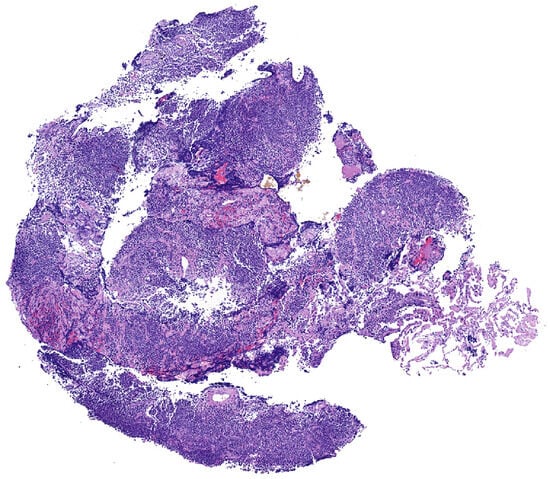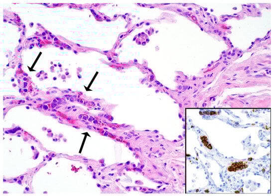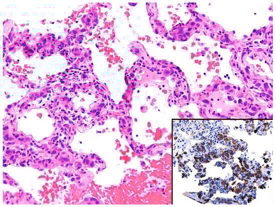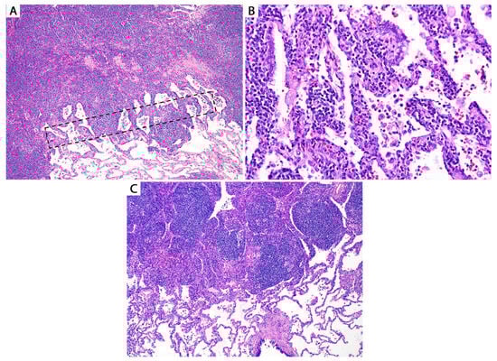 Centroblastic morphology refers to cells with an oval to irregular nucleus with fine chromatin, >1 basophilic nucleoli with a juxtanuclear membrane location, and a moderate amount of amphophilic to pale eosinophilic cytoplasm. Immunoblastic features refer to cells with a round nucleus with fine chromatin, a central eosinophilic nucleolus, and radial projections of “wispy” chromatin threads and more abundant cytoplasm, sometimes with plasmacytoid morphology (Figure 9). The tumor produces effacement of the lung architecture, and there are abundant mitoses and apoptotic bodies and variable degrees of necrosis. In areas with preserved lung parenchyma, the tumor cells may be seen admixed with fibrin and filling the alveolar spaces, a phenomenon called “tumoral pneumonia” (Figure 9) [].