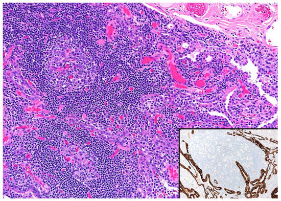 Pulmonary nodular lymphoid hyperplasia. The alveolar septa are expanded by reactive lymphoid follicles with prominent germinal centers and a few interfollicular plasma cells. Inset, pan-cytokeratin highlights displaced epithelium by the reactive lymphoid process, but no lymphoepithelial lesions.