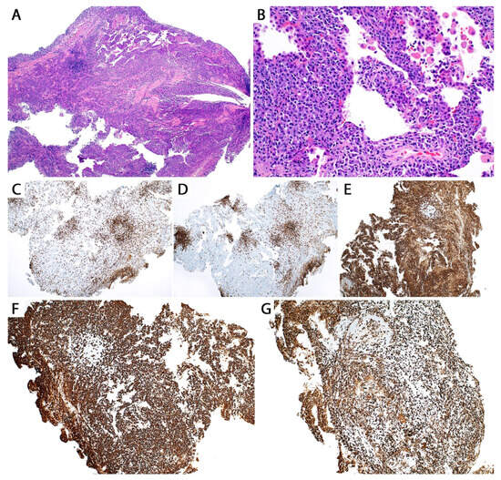 Differential diagnosis. If the lesion is mass-forming on imaging, the polymorphic nature of the specimen and the presence of plasma cells should raise concern for MALT lymphoma versus a reactive and dense lymphoplasmacytic process, such as non-specific chronic inflammation, nodular lymphoid hyperplasia, or IgG4-related lung disease (IgG4-RLD) [,]. The required IHC in this scenario includes CD3, CD20, CD10, bcl-2, bcl-6, CD21/CD23, IgG, IgG4, and kappa and lambda by IHC or in situ hybridization (ISH).