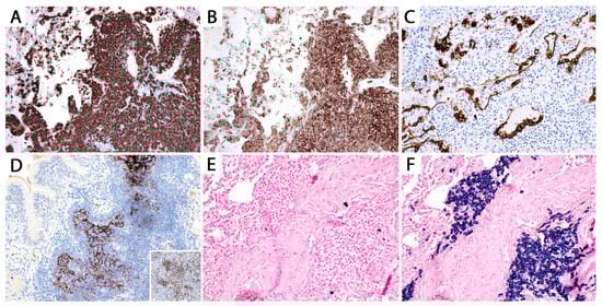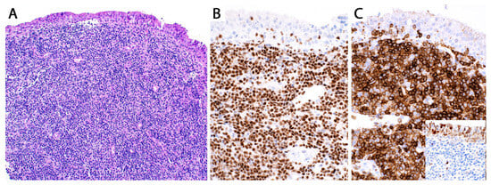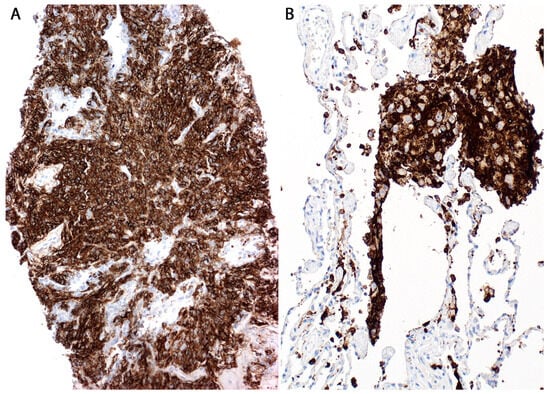 For these reasons, the diagnosis can be easily overlooked, and only a high index of suspicion will point to this diagnosis. On the contrary, cases with high tumor burden produce expansion of blood vessels that appear as alveolar septal expansion and may be interpreted as an interstitial pneumonic process []. The lymphoma cells show similar morphologic features to those described for DLBCL (centroblastic or immunoblastic) and are seen in the lumen of capillaries and of small- to intermediate-sized blood vessels. In some cases, the lymphoma cells are seen floating in the lumen, whereas in other cases, they may “pack” the entire blood vessel lumen, show “margination”, or may be admixed with fibrin or a thrombus []. IV-LBCL is positive for CD45, CD20, PAX5, CD79a, and bcl-2, with variable expression of CD5, CD10, bcl-6, and MUM1. CD15 and CD30 are usually negative (Figure 13). Most cases have a non-germinal center type immunophenotype, CD10−/bcl-6+/−/MUM1+. The lymphoma cells are negative for T-cell markers, ALK, EBER, keratins, and melanoma markers.