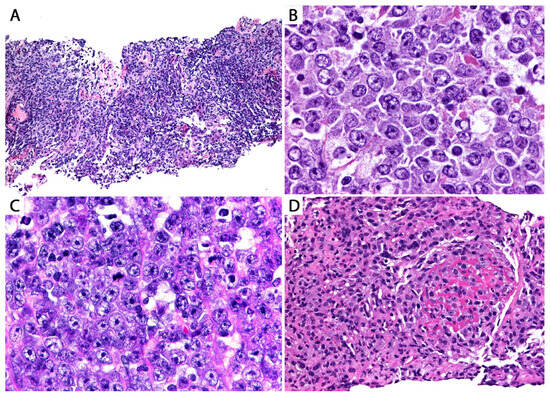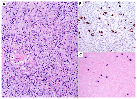 Differential diagnosis of low-grade LyG. It includes granulomatosis with polyangiitis and polymorphic lymphoproliferative disorders with scattered large cells, such as classic Hodgkin lymphoma, T-cell/histiocyte-rich LBCL, peripheral T-cell lymphoma, not otherwise specified (PTCL-NOS), NK/T-cell lymphoma with polymorphic morphology, and EBV+ polymorphic post-transplant lymphoproliferative disorder (PTLD) []. Correlation with the clinical presentation (history of immunosuppression, status post chemotherapy, hereditary immunodeficiency, etc.), presence of bilateral lung nodules, and skin or central nervous system involvement are helpful to place LyG at the top of the differential diagnosis. IHC and ISH are required to confirm the diagnosis, which shows a heavy infiltration of CD3+ T-cells with scattered large EBER+/CD20+ B-cells. In classic Hodgkin lymphoma, the Reed–Sternberg cells are CD20−, CD30+, and CD15+/−, which contrasts with the immunophenotype described for the large cells of LyG. T-cell/histiocyte-rich LBCL has a similar immunophenotype to LyG, but this tumor is negative for EBER and contains abundant CD68+/CD163+ macrophages. Both classic Hodgkin lymphoma and T-cell/histiocyte-rich LBCL may contain non-necrotizing granulomas, a feature not seen in LyG, and may affect the lung only in advanced stages of disease. Therefore, prior clinical history is extremely helpful in this context.