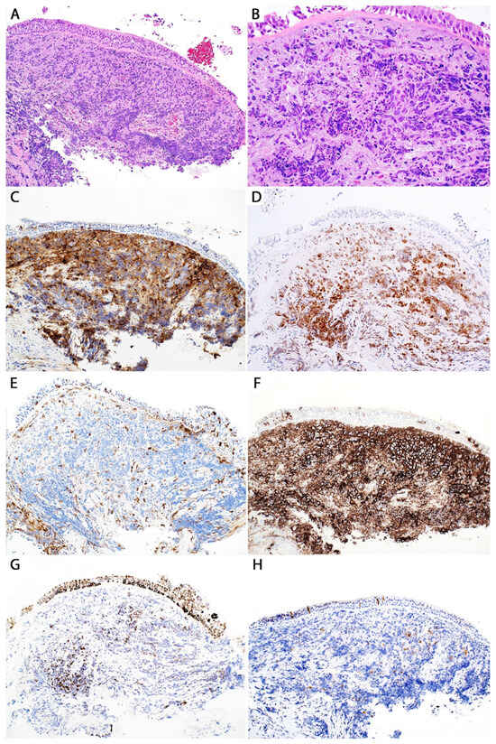 Differential diagnosis of pulmonary DLBCL. Transbronchial biopsy of a 70-year-old man with a history of heavy smoking with a large hilar mass who also had a history of CD10+ DLBCL in remission. (A,B) The morphology suggests small cell carcinoma, but DLBCL could not be excluded given the prior history and the marked crush artefact. The tumor cells are positive for (C) CD10 and (D) PAX5, potentially misleading to a diagnosis of relapsed CD10+ DLBCL. CD20 was negative (not shown) but the patient had received rituximab in the past. Additional immunohistochemical stains show that the tumor cells are negative for (E) CD45, positive for (F) CD56, and focally positive for (G) pan-cytokeratin and (H) synaptophysin, confirming small cell carcinoma.