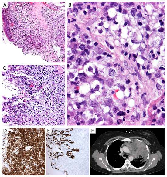 Primary mediastinal (thymic) LBCL extending to the lung should be ruled out by clinical and imaging correlation, such as the case of a young woman with an anterior mediastinal mass that is extending into the lung, versus that of an older man or an adult with a single peripheral lung nodule or multiple lung nodules []. This lymphoma shows clear cells and variable degrees of fibrosis, and these features may or may not be observed in cases involving the lung (Figure 12).