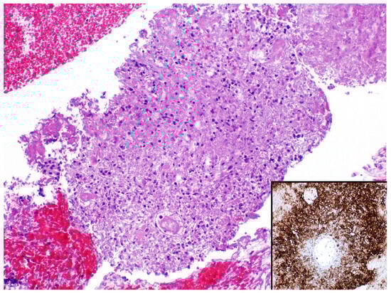 Intravascular LBCL is a rare subtype of LBCL with specific clinicopathologic features. This neoplasm shows characteristic intravascular involvement by large lymphoma cells in multiple organs, hence the name. A lack of homing receptor molecules, such as CD29 (beta-1 integrin) and CD54 (ICAM-1), on the surface of lymphoma cells impairs their ability to exit the tissues and partially explains their peculiar intravascular location []. The most common affected sites include the skin, the lungs, and the central nervous system, but any organ may be involved by IV-LBCL. Lung involvement is part of the so-called “Asian form of IV-LBCL” that features multisystemic involvement along with hemophagocytic syndrome [,,]. The disease shows non-specific clinical and imaging findings, and only a high index of suspicion will point toward this diagnosis, which may only happen after several other conditions have been excluded. Unfortunately, most patients go underrecognized and the histopathologic diagnosis is established at late stages of the disease or only at autopsy. Overall, IV-LBCL has a poor prognosis despite the use of current DLBCL-based chemotherapy.