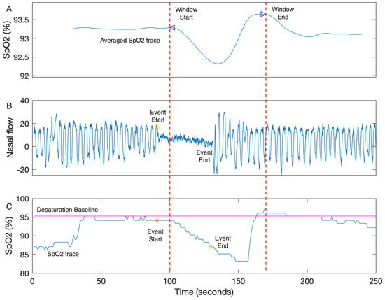 The authors present the unit of HB as %minutes per hour of sleep which is equivalent to a measure with units of % scaled by a factor of 60. The calculation for HB can be decomposed into three main steps: (1) All SpO2 segments associated with manually scored respiratory events for one individual recording are averaged and processed to calculate the boundaries of a search window. The search window boundaries are determined by the two peaks of the averaged respiratory event as shown in Figure 2A. (2) The desaturation baseline for each respiratory event (Figure 2B) is calculated as the maximum SpO2 value within 100 s prior to the end of the event (Figure 2C). (3) The desaturation area for a single respiratory event is the area within the search window, desaturation baseline, and the SpO2 trace, as shown in Figure 2C. HB is then calculated using Equation (1) [14]. Other researchers have attempted to replicate HB with varying success. Trzepizur et al. [50] developed their own algorithms for HB but post hoc analysis by Mehra and Azerbarzin [14] suggested Trzepizur et al.’s method underestimated HB [51]. Based on the published material in [14], the algorithm was replicated by de Chazal et al., and the MATLAB code is publicly available in the online sharing platform GitHub (https://github.com/pdechazal/Hypoxic-Burden (accessed on 16 October 2023)). Two other commercial software packages calculate HB, Respironics (Murrysville, PA, USA) and Cidelec (Sainte-Gemmes-sur-Loire, France) [52]. However, the lack of a full disclosure of the algorithmic details of HB by the original authors has led to some confusion in the reproducibility of the HB calculation.