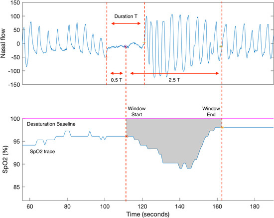 where the unit of each desaturation area is %seconds and the unit of REDTA is % hours [47]. REDTA is calculated using three main steps: (1) The search window is fixed and starts from the midway through the event and extends for 2.5 times the event duration. The search window is population-based (derived from the SHHS study) and is assumed to be appropriate for all respiratory events. (2) The desaturation area for a single respiratory event is the area between the 100% desaturation baseline and the SpO2 trace within the search window, as shown in Figure 3. (3) REDTA is the sum of the desaturation area divided by 3600. REDTA does not include the total time of sleep in the calculation. Its value increases with longer desaturation duration, more desaturation events, and greater depth of desaturation [47], and it thus is a measure of the hypoxemia insult per night. The software ABOSA (Version 1.1) implements REDTA [56]. The unit of REDTA is % hours.