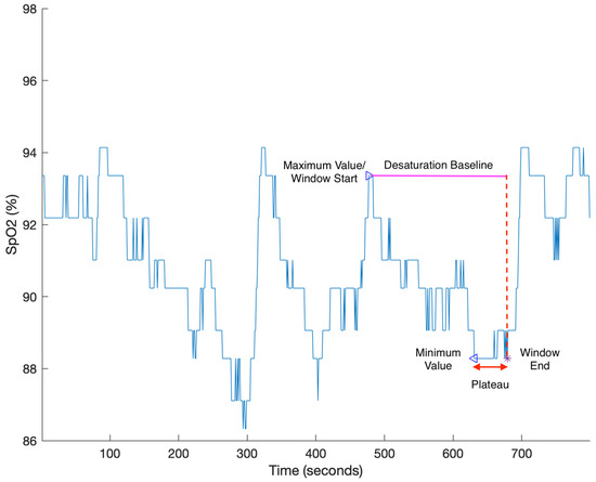 DesSev is calculated as the sum of the desaturation area divided by the total time of sleep. The desaturation area is calculated as the area between the desaturation baseline (magenta) and the SpO2 trace (blue) within the search window. The search window is to be defined as the time between the maximum and minimum values (blue triangles). However, due to the presence of a plateau (red arrow), the end of the search window is shifted forward to the end of the plateau (purple star). The desaturation baseline is the maximum value associated with the event [56].