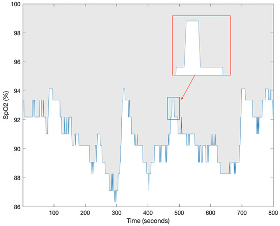 Hypoxia load (HL) differs from other desaturation area-based parameters, as it is independent of any desaturation threshold or respiratory events. As shown in Figure 5, HL is defined as the desaturation area above the SpO2 trace divided by the total time of sleep. The calculation of HL can be divided into two steps: (1) The SpO2 saturation area is calculated by the numerical integration of the SpO2 trace using the trapezoidal rule, as shown in Equation (5):