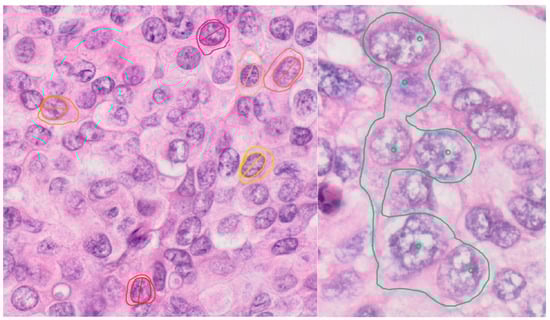 The evaluation and quantification of cytoplasm in tumor cells. In first case (left), the cellular membrane can be easily identified on slides, so it was not measured, while, in the second case (right), the cellular membrane could not be evaluated and measured, so areas including more cells were measured and the nuclei number was counted.