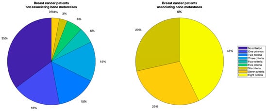 Considering as criteria the eight parameters (without axes ratio) with their cut-off values for breast cancer patients with associated bone metastases, which are given in Table 2, it was observed that all the patients with breast cancer with associated bone metastases respected at least six out of eight criteria, while 94.11% of the patients without known bone metastases had at most five out of eight criteria respected. The considerations given above can be observed in Figure 3.