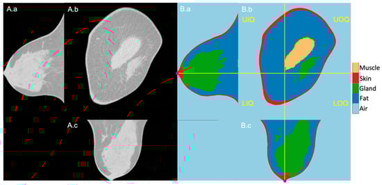 Exemplary BCT original (A) and segmentation (B) images in longitudinal (a), coronal (b), and horizontal (c) planes. (B): From dark to bright grey level, air, fatty tissue, mammary glands, skin, and pectoralis muscle. The four breast quadrants—UIQ, UIQ, LOQ, LIQ—are divided by the perpendicular planes (yellow lines) crossing the nipple position (purple dots in the longitudinal and horizontal planes).