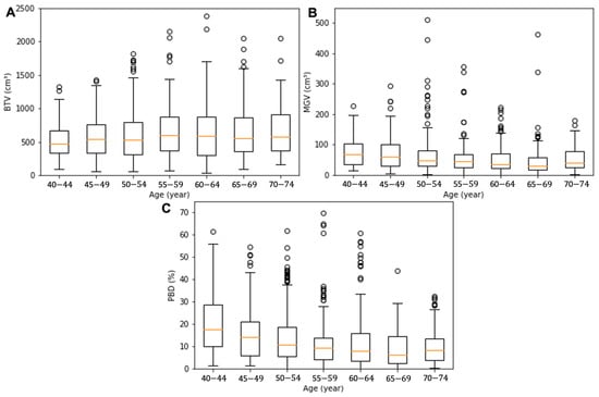 Box and whisker plots for the BTV (A), MGV (B), and PBD (C) of the age sub-cohorts. The orange line in the box denotes the median value, the box the interquartile range (lower quartile to upper quartile), the whiskers the minimum and maximum values of the categories excluding the outliers, and the circles the outliers.