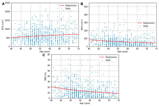 The obtained descriptive estimation models of the BTV, MGV, and PBD as a function of the patient’s age are presented in (6)–(8), respectively. The uncertainty in the regression coefficients and constants were 86 and 345 for (6), 822 and 15 for (7), and 160 and 2.9 for (8), respectively. All regression parameters’ p values were below 0.05 except the constants of the regressions for BTV (p = 0.11) and MGV (p = 0.09). The logarithmic and multiplicative inverse models with the optimized coefficients are fitted in the red line in Figure 3. The regression models’ RSEs were 386 cm3, 67 cm3, and 13%, respectively, for the BTV, MGV, and PBD plots.