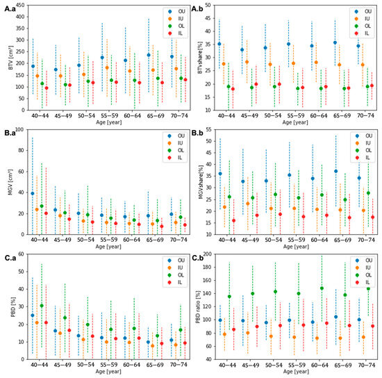 The quadrant BTV (A.a), MGV (B.a), and PBD (C.a) and the quadrant shares of BTV (A.b) and MGV (B.b) and the ratio of quadrant PBD (C.b) to the entire breast for each age group.