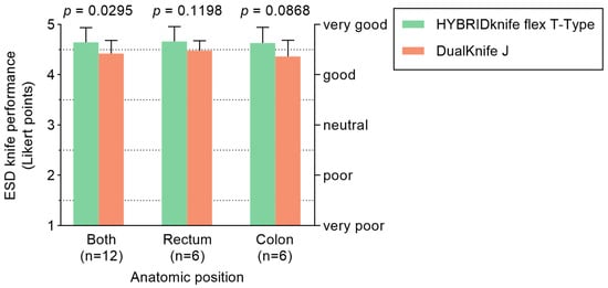 The mean ESD performance score (Figure 2) of the HK-T (4.7 ± 0.29 LP) was significantly better (p = 0.0295) than that of DK-J (4.4 ± 0.26 LP). This difference was not significant in subgroup analyses of rectal (4.7 ± 0.30 LP versus 4.5 ± 0.19 LP; p = 0.1198) and colonic ESDs (4.6 ± 0.31 LP versus 4.4 ± 0.32 LP; p = 0.0868). However, colonic ESDs showed a statistical tendency in favor of HK-T (p = 0.0868). Evaluation of the individual performance aspects of both ESD knives (Figure 3) revealed significant advantages of HK-T in injection ability (medians HK-T: 5 LP versus DK-J: 3 LP, p < 0.0001) and hemostatic property (medians HK-T: 5 LP versus DK-J: 4 LP, p = 0.0452). In addition, a non-statistically significant difference was seen for HK-T in terms of coagulation mark visibility (medians HK-T: 5 LP versus DK-J: 4 LP, p = 0.0758), working speed during submucosal cushioning (medians HK-T: 5 LP versus DK-J: 4 LP, p = 0.0800), and electrode visibility (medians HK-T: 5 LP versus DK-J: 4 LP, p = 0.0949).