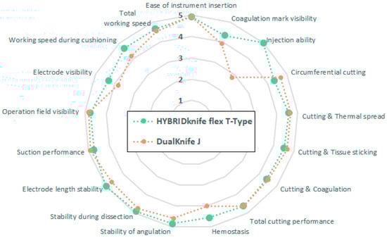 Individual mean performance scores of HYBRIDknife flex T-Type (green) and DualKnife J (orange) evaluated by three experienced endoscopists for colorectal endoscopic submucosal dissection. 5 = very good; 4 = good; 3 = neutral; 2 = poor; 1 = very poor.