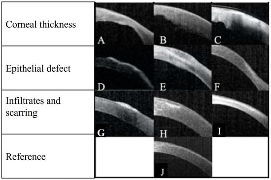 - Soliman, W.; Fathalla, A.M.; El-Sebaity, D.M.; Al-Hussaini, A.K. Spectral domain anterior segment optical coherence tomography in microbial keratitis. Graefe’s Arch. Clin. Exp. Ophthalmol. 2013, 251, 549–553. [Google Scholar] [CrossRef]