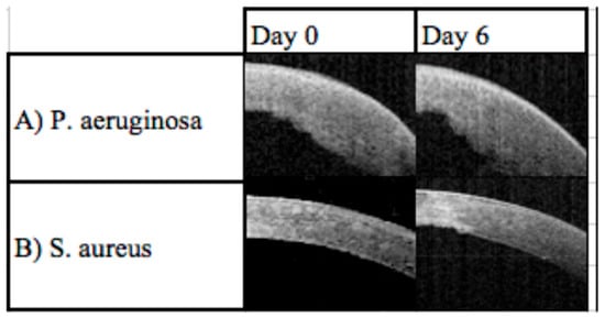 - Konstantopoulos, A.; Yadegarfar, G.; Fievez, M.; Anderson, D.F.; Hossain, P. In vivo quantification of bacterial keratitis with optical coherence tomography. Invest. Ophthalmol. Vis. Sci. 2011, 52, 1093–1097. [Google Scholar] [CrossRef]
